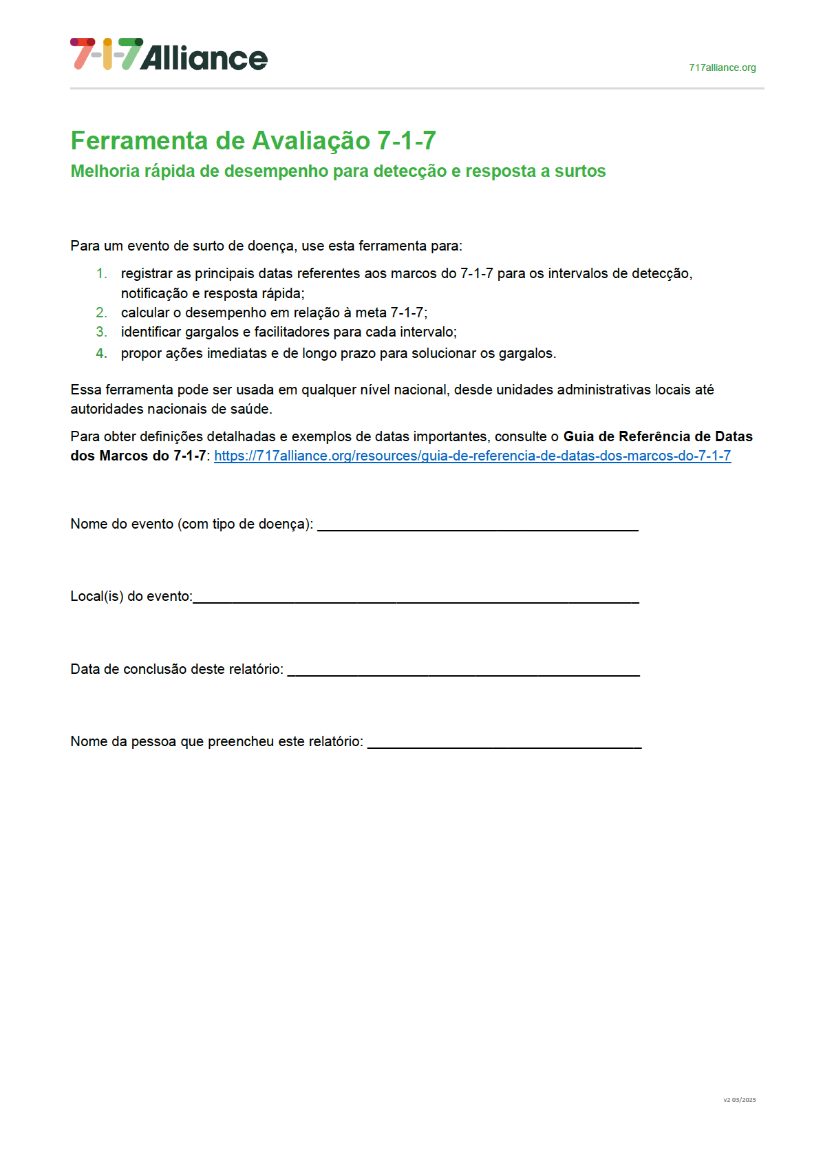 Documento Word que pode ser usado por autoridades de saúde pública ou equipes responsáveis pela investigação inicial ou resposta rápida para coletar dados 7-1-7.