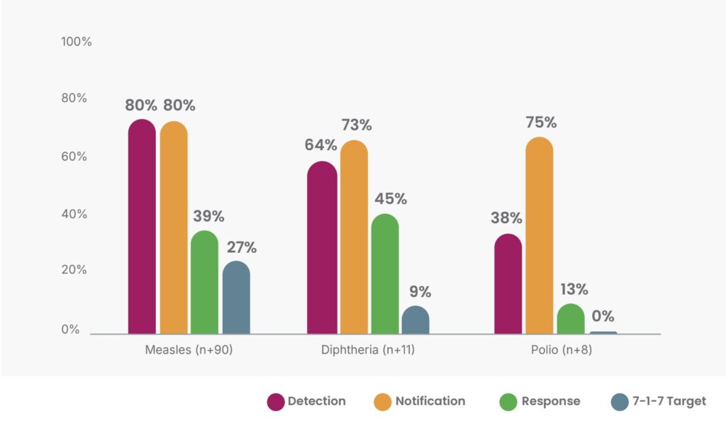 7-1-7 VPD timeliness performance by disease—measles, diphtheria and polio. Fewer than half of measles outbreaks reached the 7-day response target. Only 9% of diphtheria outbreaks met the full target. Zero percent of polio outbreaks in our dataset met the full 7-1-7 target—likely linked to limited in-country capacity.