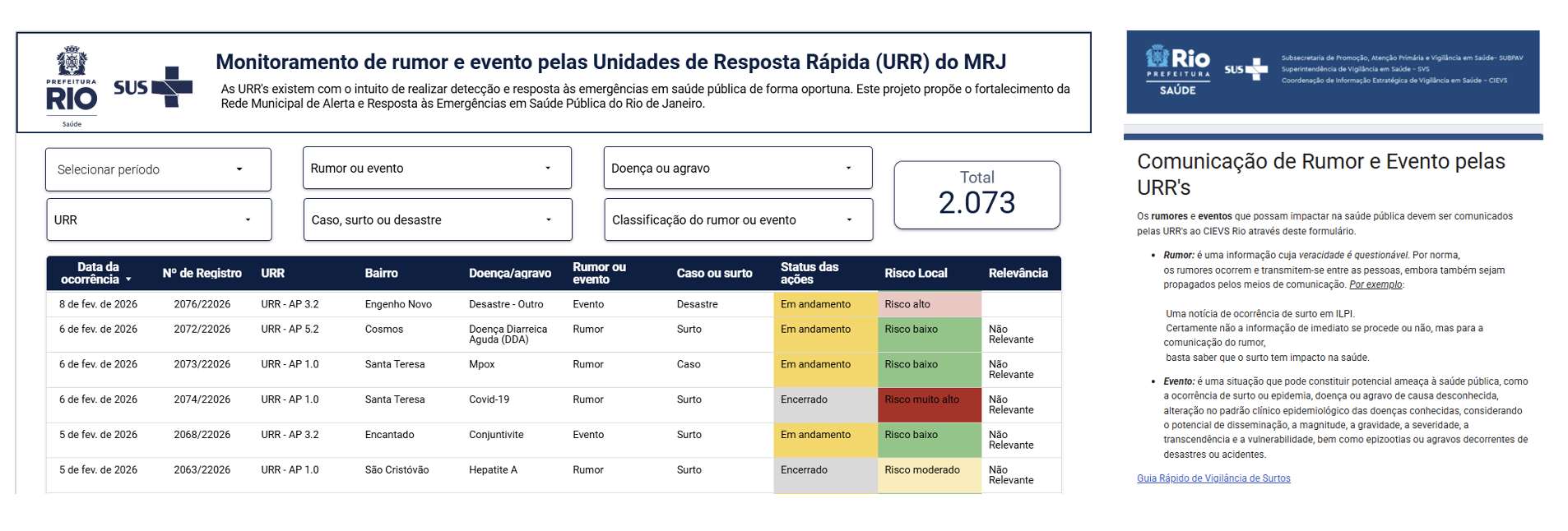 O município do Rio de Janeiro tem mais de 6 milhões de habitantes e é a principal porta de entrada do turismo no Brasil — o que traz tanto oportunidades quanto desafios para a segurança em saúde. Precisávamos de uma forma de fortalecer o desempenho da resposta a surtos e oferecer às equipes de saúde parâmetros claros para ações oportunas.
