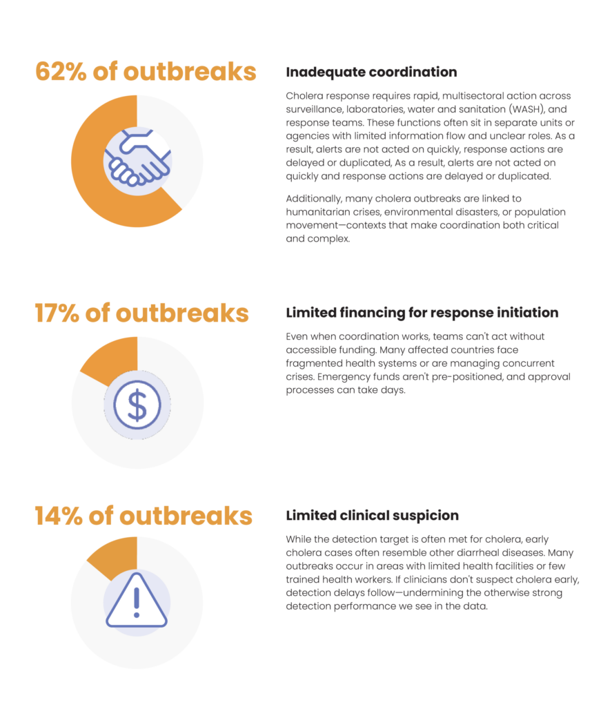 As cholera surges globally, 7-1-7 data from 52 outbreaks across six countries point to a persistent challenge: In nearly two-thirds of cholera responses, coordination constraints delay critical action.