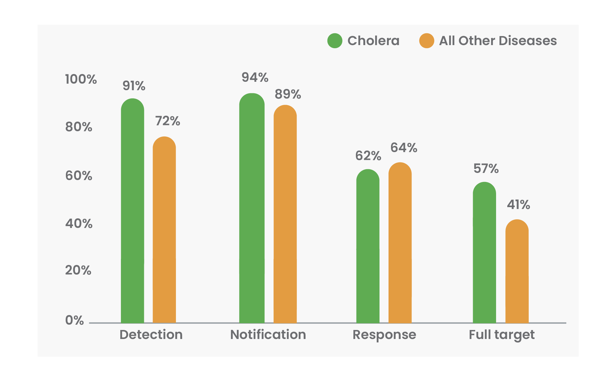 Across the 52 cholera outbreaks from six countries in our analysis, detection and notification performance was strong (90% and 94% of outbreaks met the detection and notification targets, respectively)—among the highest of any outbreak type. But response lagged: only 62% of outbreaks completed early response actions within seven days of notification––a slightly weaker performance than the average across all diseases.